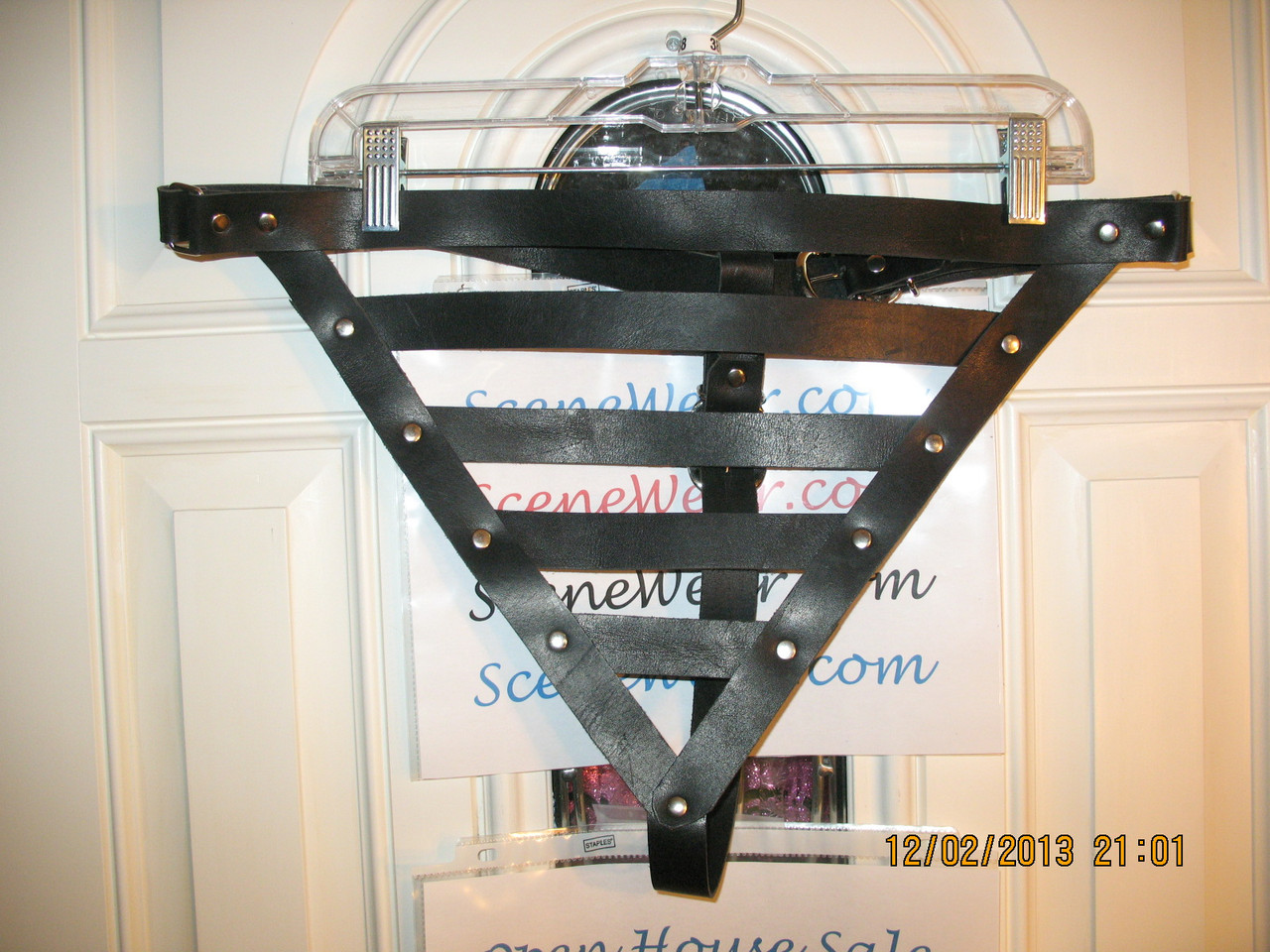 This harness style G- String is a sexy semi-covered look. It can be made to fit any body size, and is scaled appropriately for larger sizes. There is also a matching harness type bra available in all sizes as well. Price goes up with sizing ( price shown is for small to Medium) and various options available.